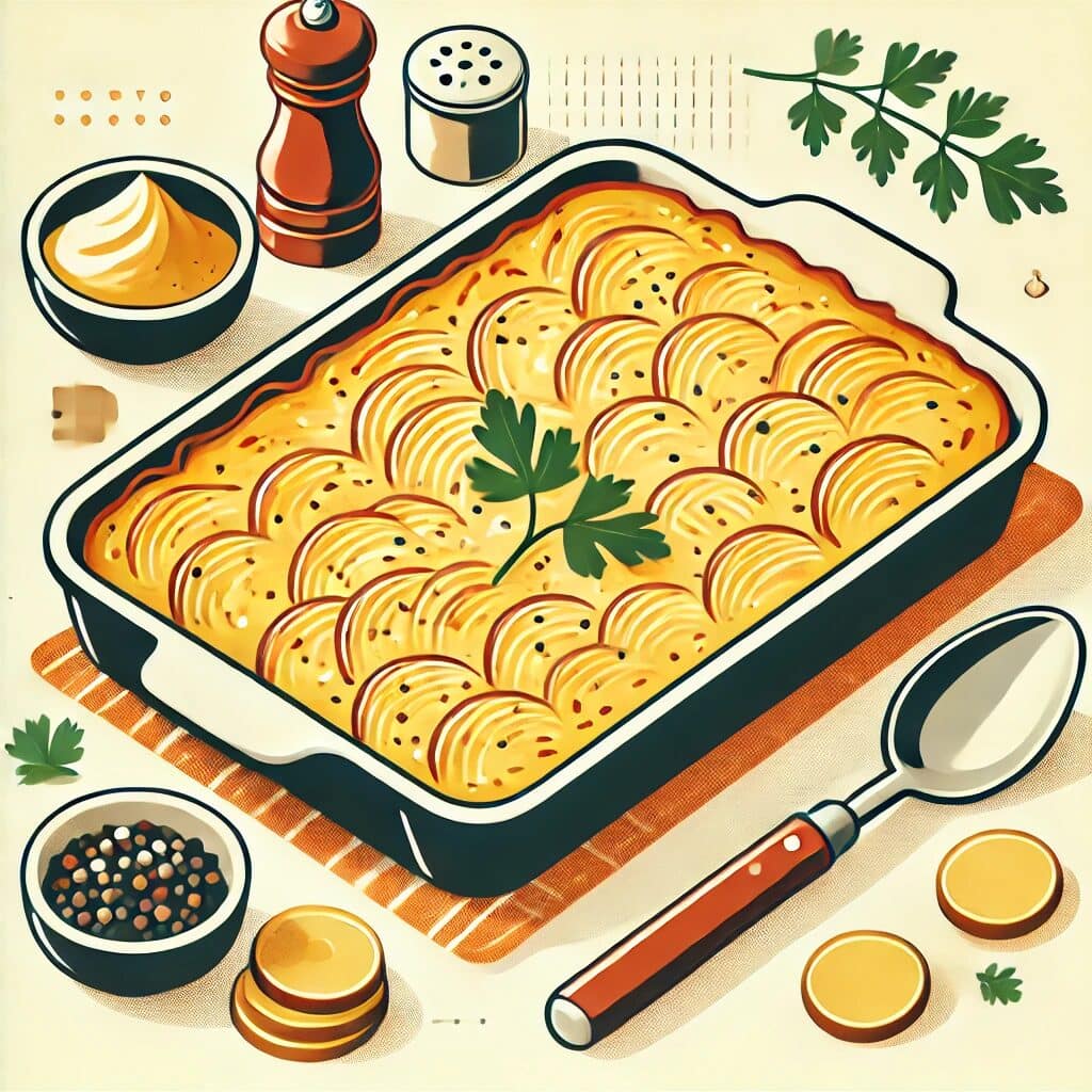 作り方: 薄切りにしたじゃがいもを牛乳や生クリームとともに煮込み、チーズをかけてオーブンで焼く。
