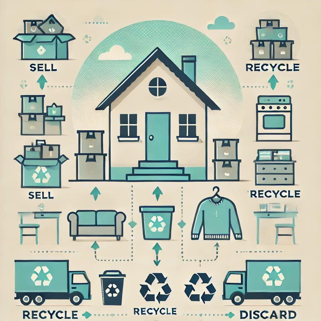- 処分方法を選択する:不要な物は売却、寄付、廃棄のいずれかの方法で処分します。特に大型家具はリサイクルショップやフリマアプリを活用すると良いでしょう。