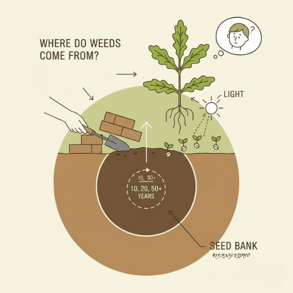 - 埋土種子(シードバンク): ずっと前から土の中で眠っていた種が発芽する。